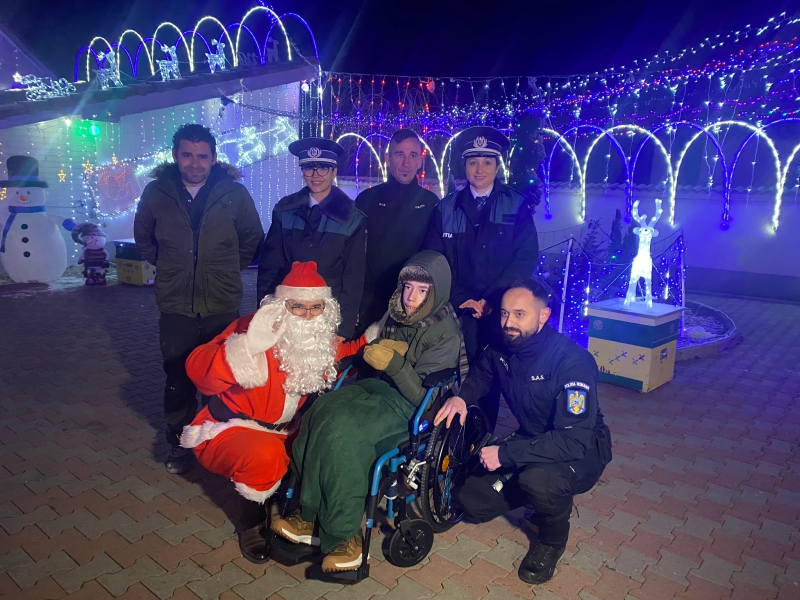 Moș Crăciun, împreună cu polițiștii Serviciului pentru Acțiuni Speciale l-au dus cu autospeciala de poliție până la Sântimbru unde, prin bunăvoința domnului Bogdan Ioachim, s-a putut bucura de miile de luminițe de Crăciun care îi decorează curtea.